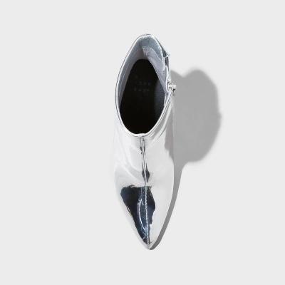 Add a bright pop of metallic magic to your footwear with these Shandra Ankle Boots from A New Day™. These pointed-toe boots feature a dazzling silver upper to add shimmer to your wardrobe, allowing you to shine on any occasion. Set on 3.25-inch stiletto heels for statement lift, the ankle boots have cushioned insoles and soft lining for comfortable wear, and a side zipper running down the shaft completes the look.